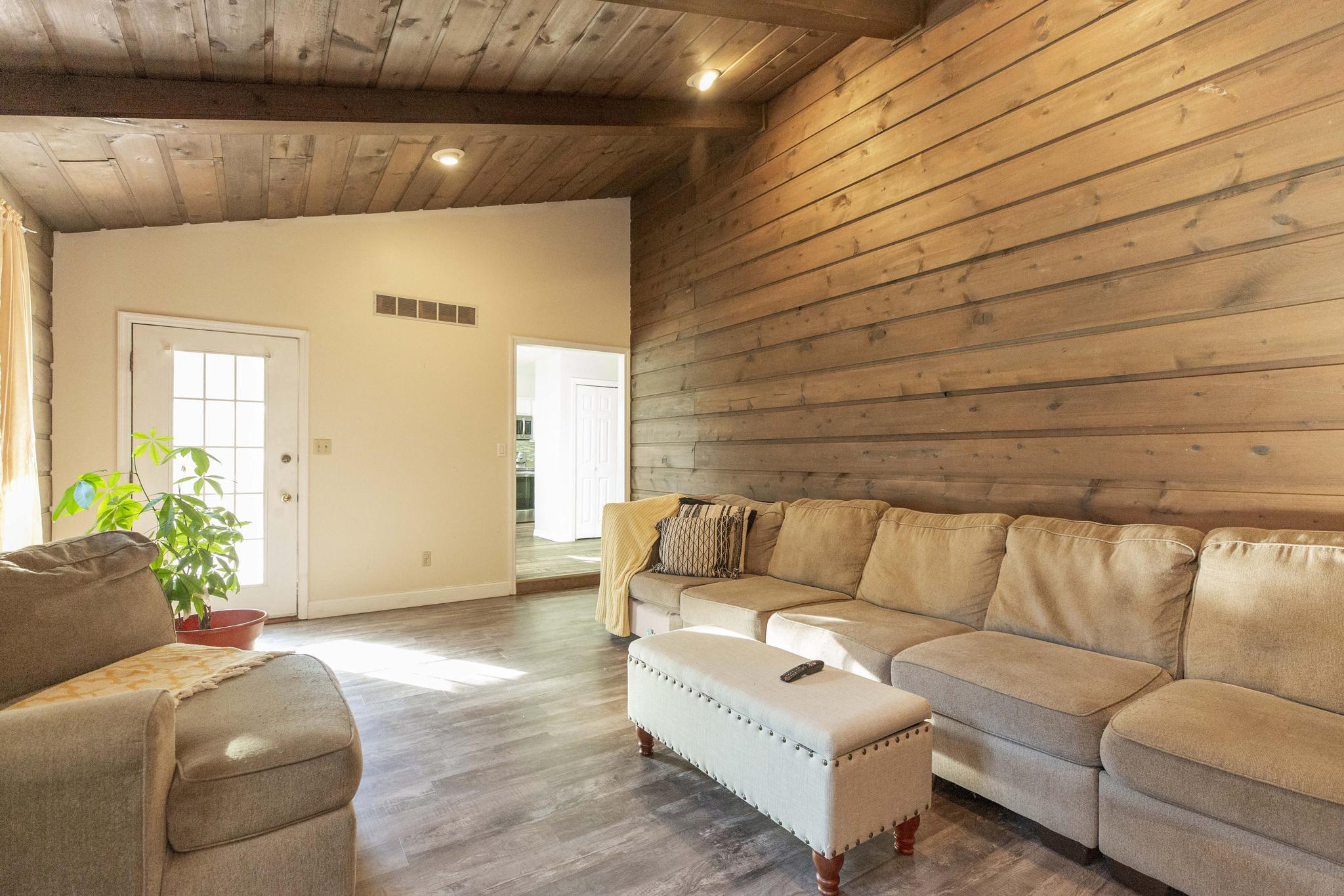 Spacious vaulted family room with stone-faced wood-burning fireplace