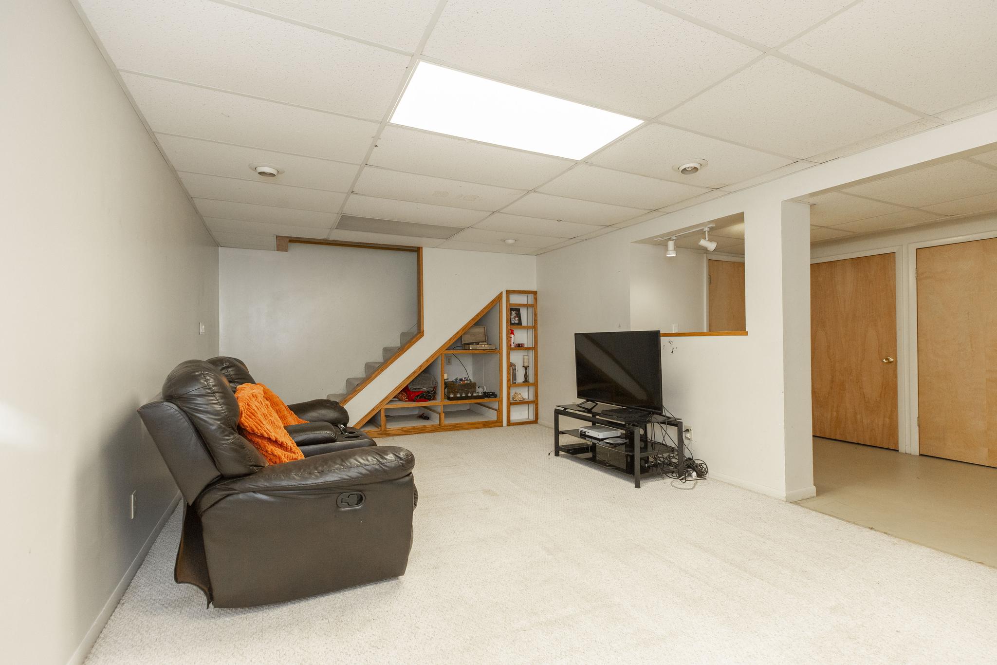 Finished basement with built-in cabinets, large closet, and entertainment space
